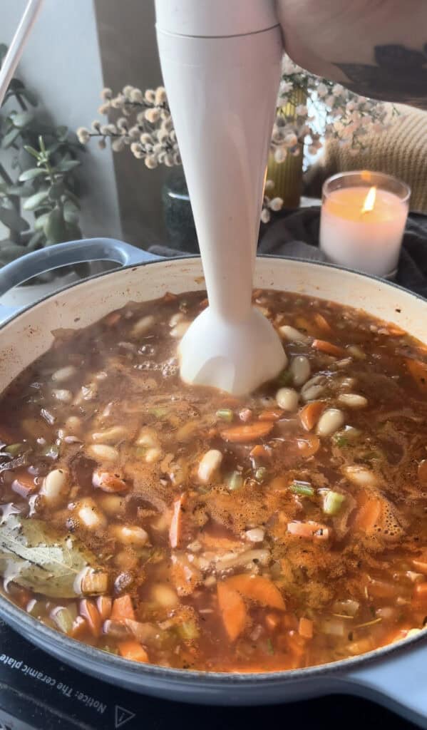 If you want a smoother soup, you could blend all or even ¾’s of the ingredients, leaving just a few chunks of carrot and beans etc.